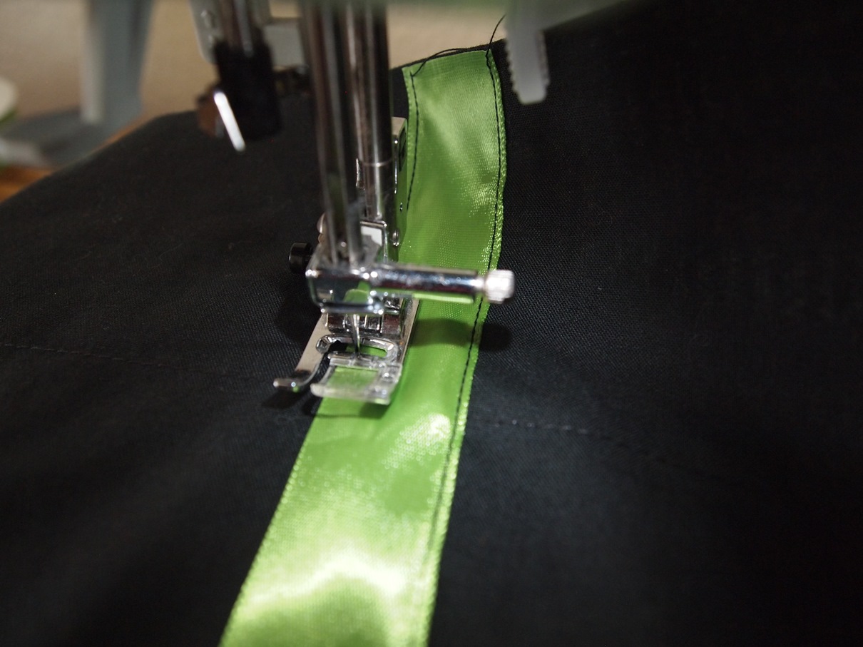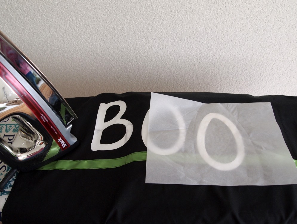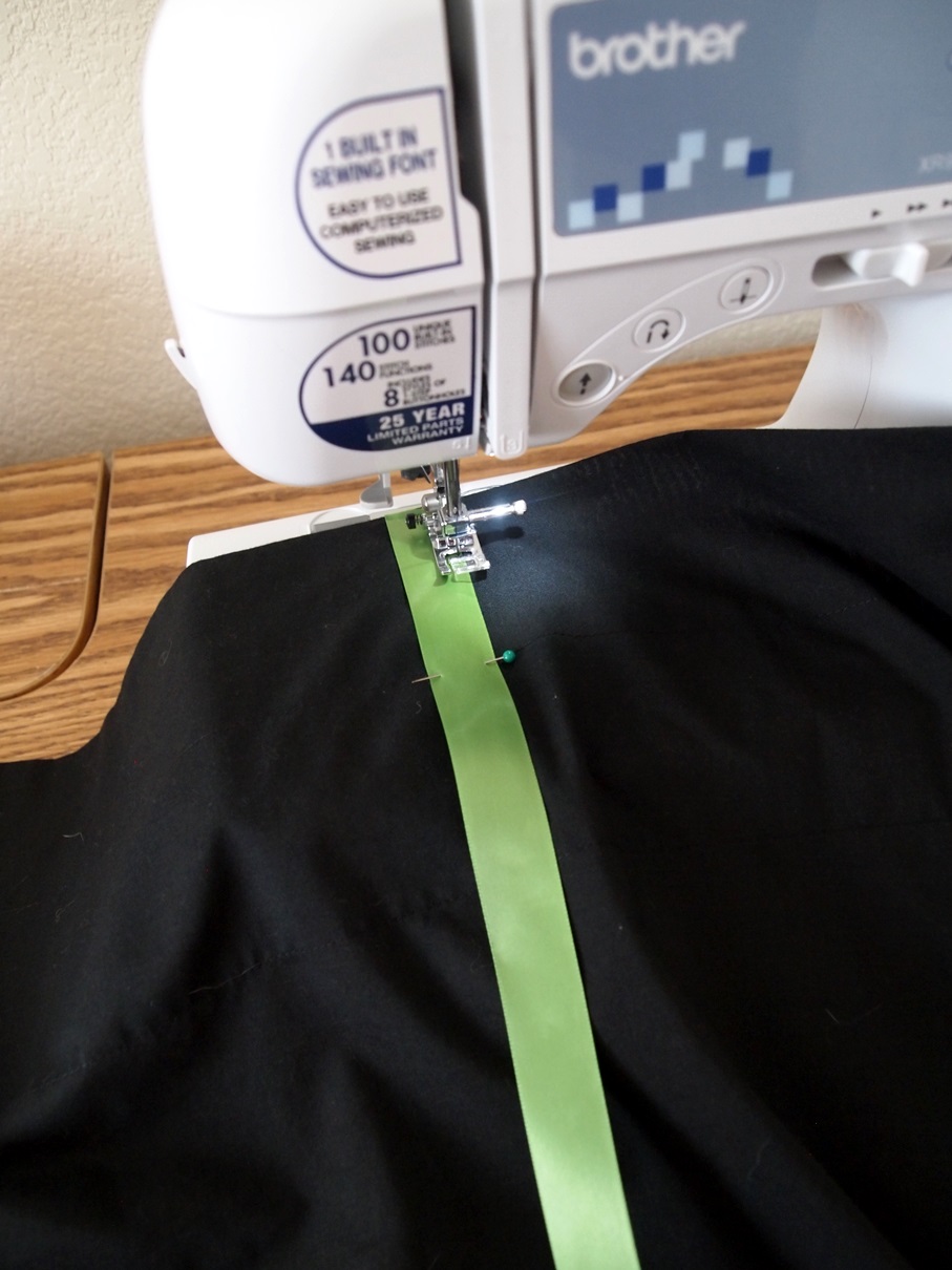 The ribbon isn’t exactly straight… I didn’t feel like putting in the additional effort that would have required… but I’m still pretty happy with how it turned out. And it cost next to nothing (maybe a dollar, if that… I used a leftover piece of fabric from a $2 goodwill curtain I’m using for my Dwarf costume belts, plus some ribbon and one fabric transfer sheet… can’t complain there). Here are a few photos of the process: