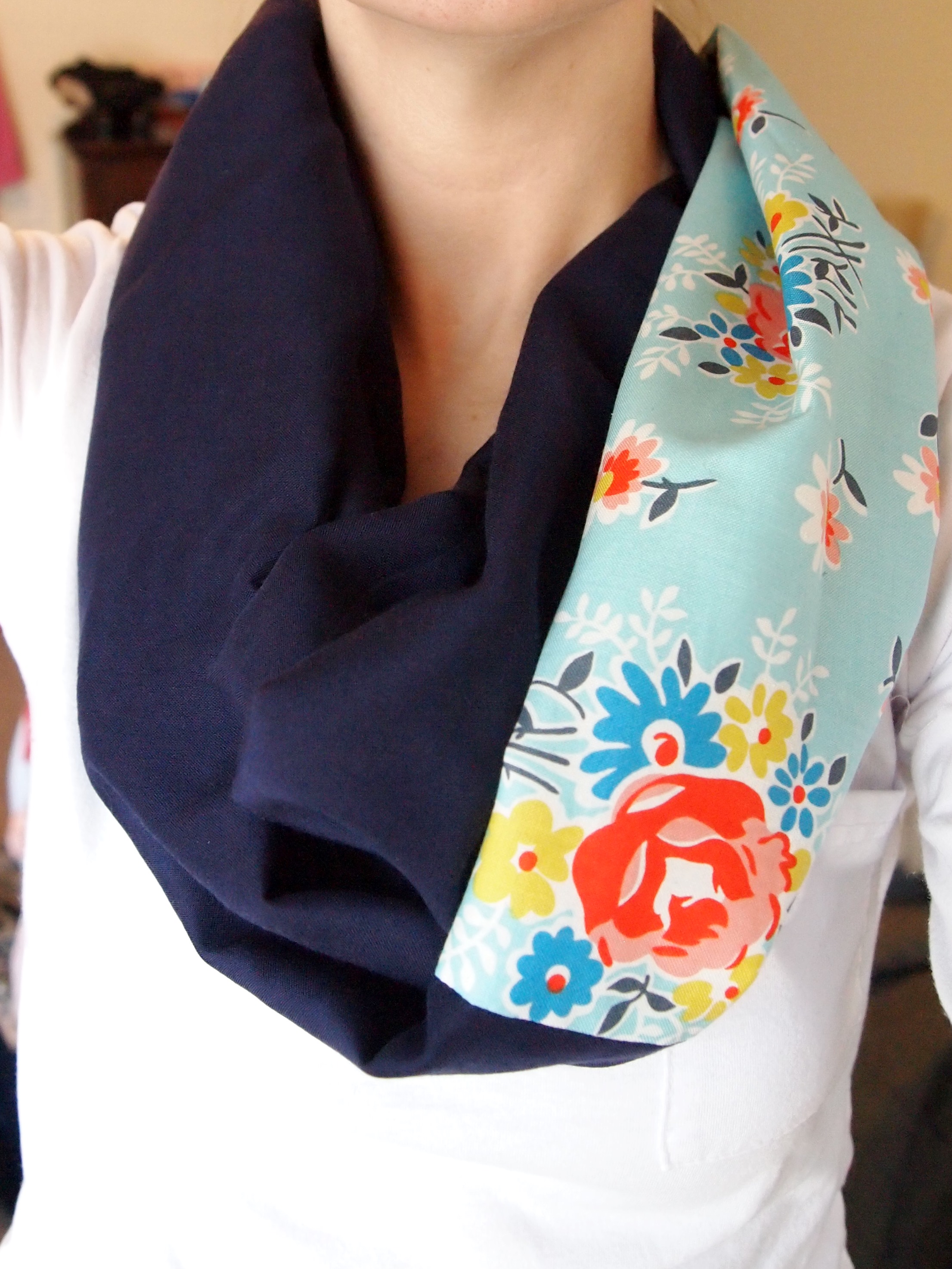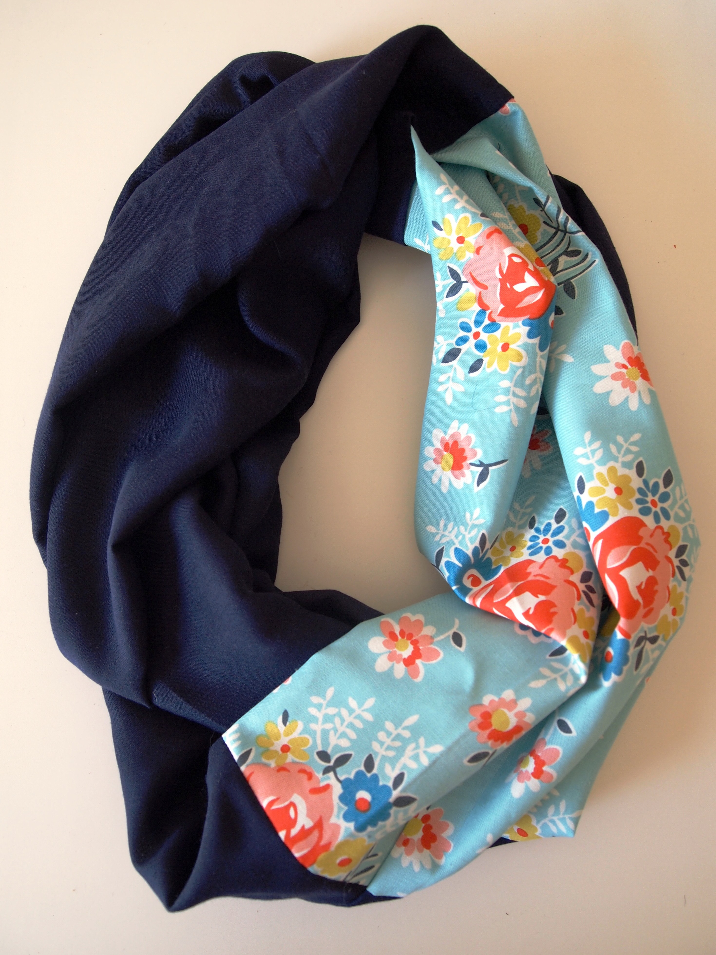 I really liked the flower pattern on one of the pieces of fabric I got to make my alphabet magnets a few months ago, but wasn’t sure what I could do with it until I ran across a nice lightweight blue fabric on the red tag sale at Joann’s the other day. I decided it would make a great scarf. The colors coordinated perfectly… so I used this and this as inspiration to create my own infinity scarf (sewing project #10). A simple project… plus it only cost me $2.55 and less than an hour of my time. I used exactly 1/2 yard of the blue fabric and a small rectangle of the flowery fabric – in the photos it is doubled-up; it’s one big circle otherwise.