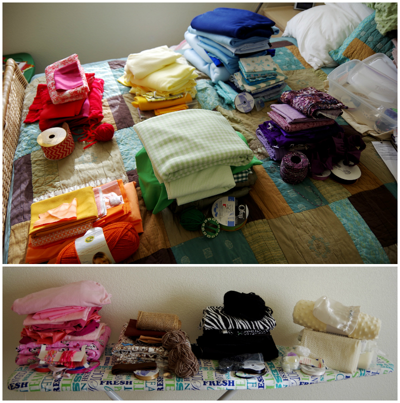 Here’s what I started with. I made a huge mess and went through all of my fabric, ribbon, buttons, etc. to sort everything into colors. From there I decided what I wanted to use for each page to get a good mixture of colors and textures.