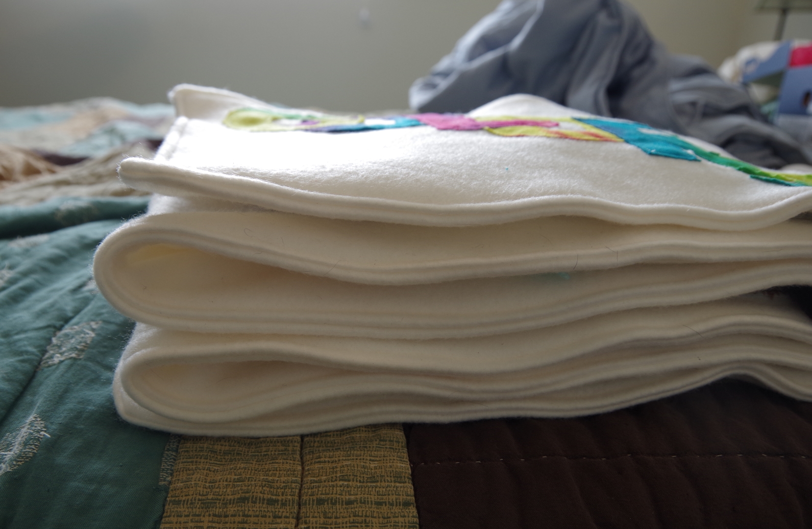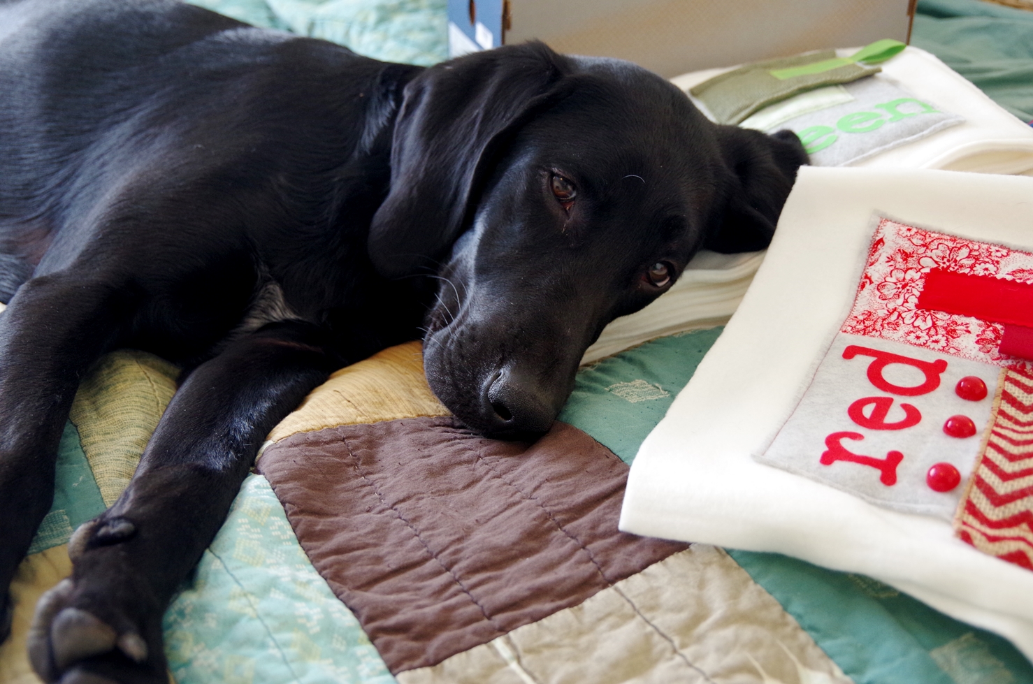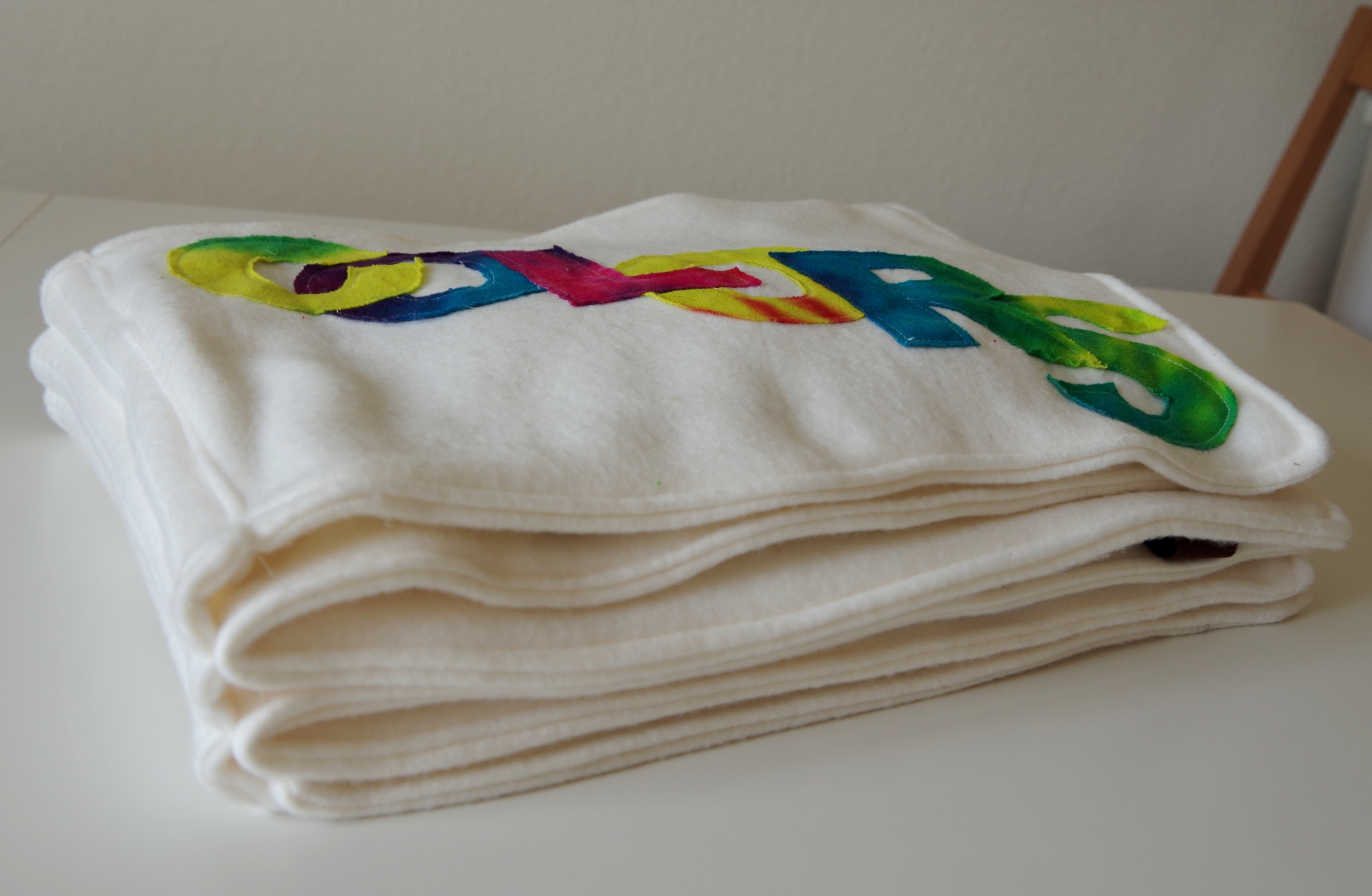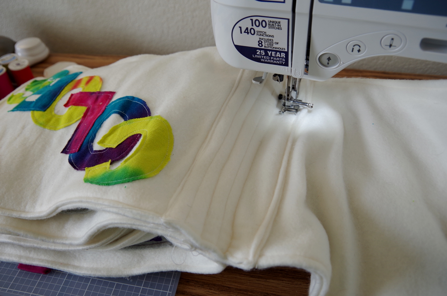Note: For the cover, I used the letter stencils I had in my drawer from the alphabet magnets I made last year and scraps of leftover tie-dye t-shirt from my first batch of adopt me vests for BDAR. I starched them and ironed them on with fusible interfacing.