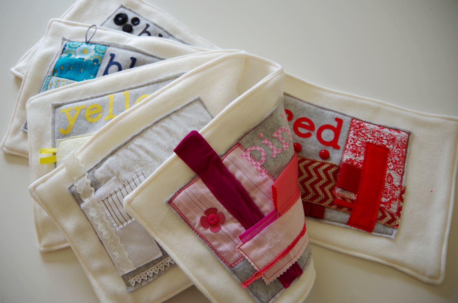 Step 1: Cut long rectangular strips of fleece and sew your pages to them. With right sides together, sew coordinating pages together, flip inside out and sew along each edge to finish. (This is where you should probably pay attention to get them in the correct order) :)