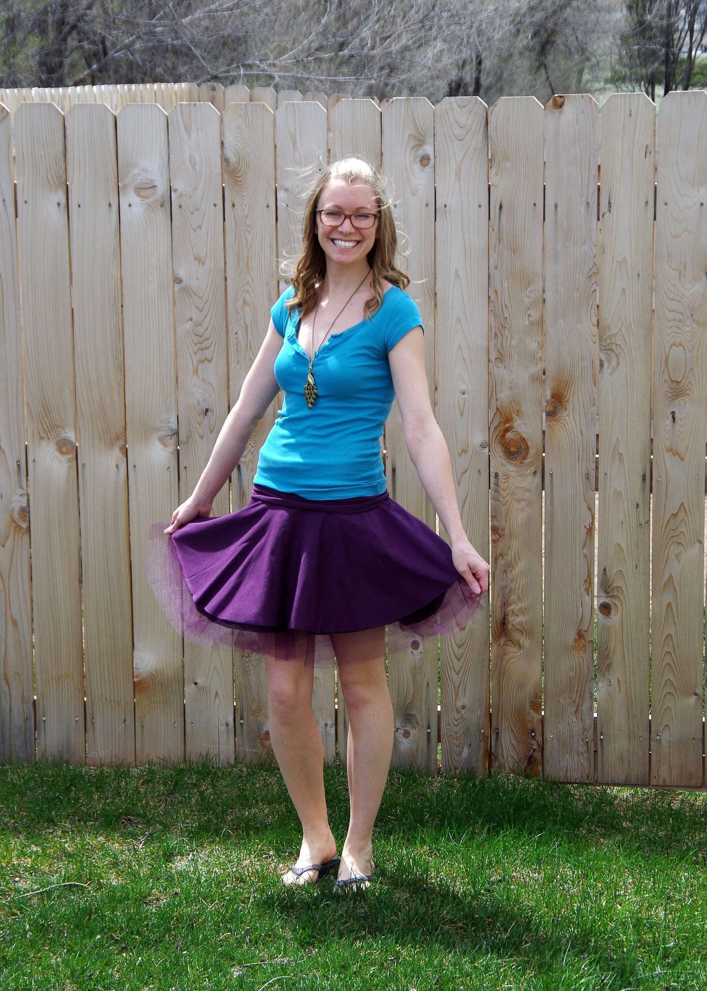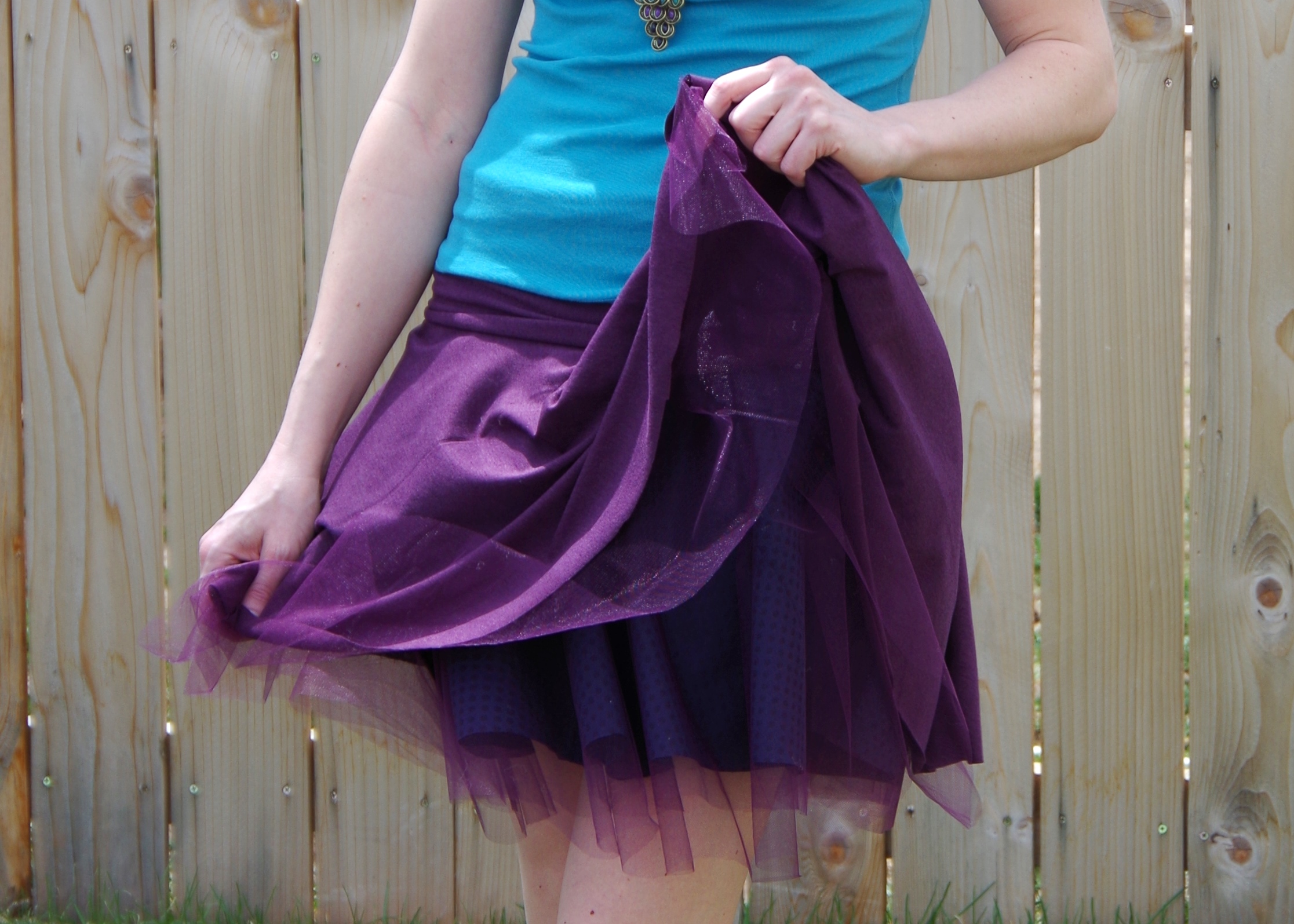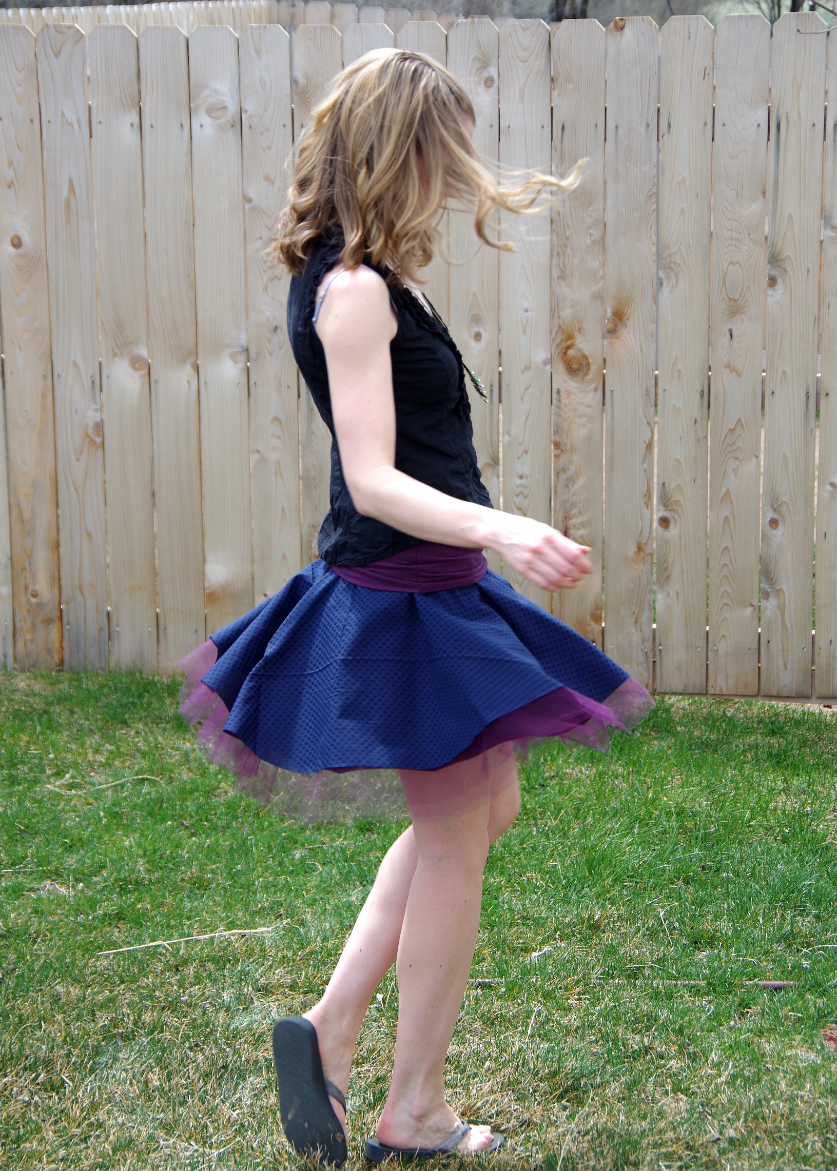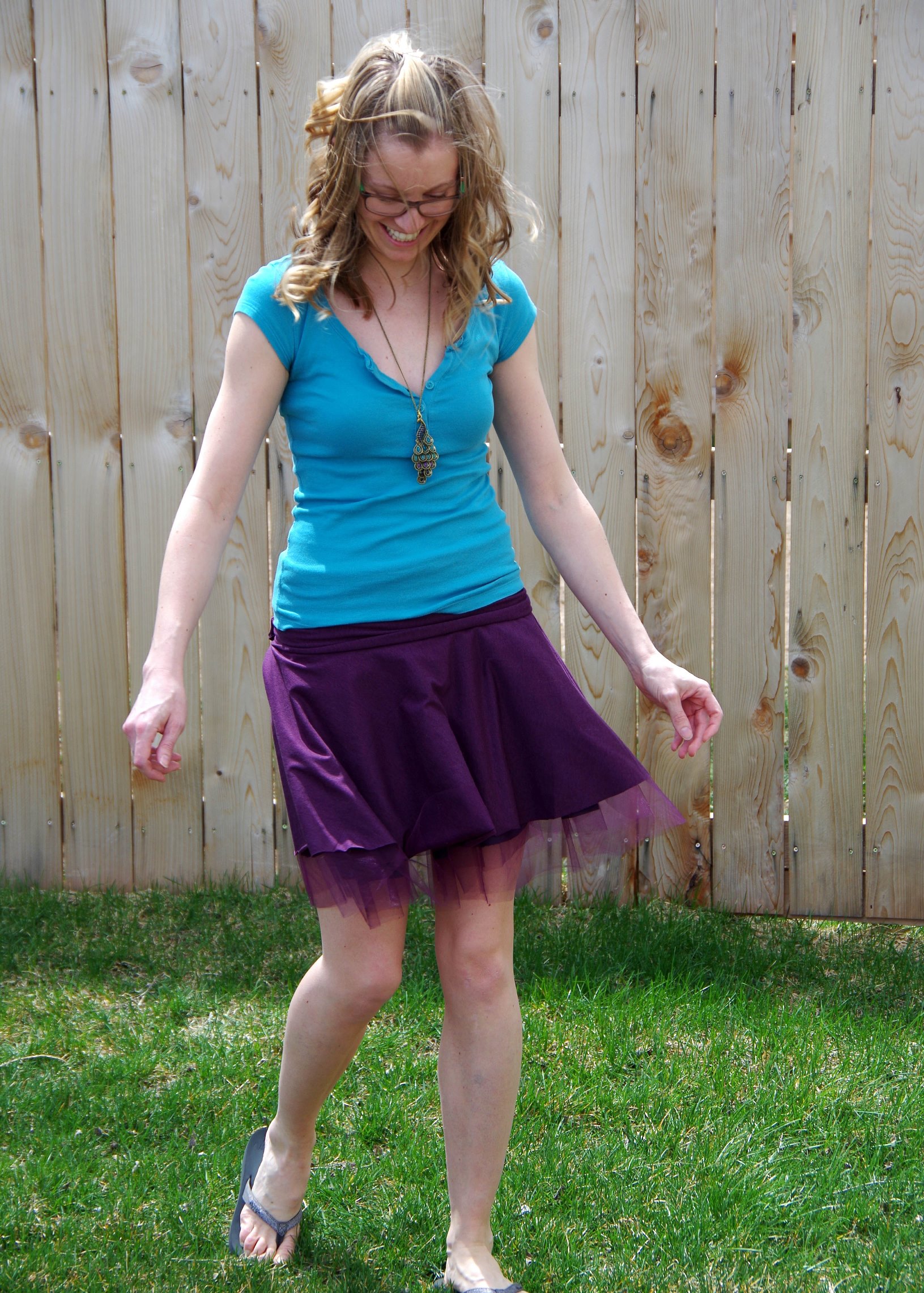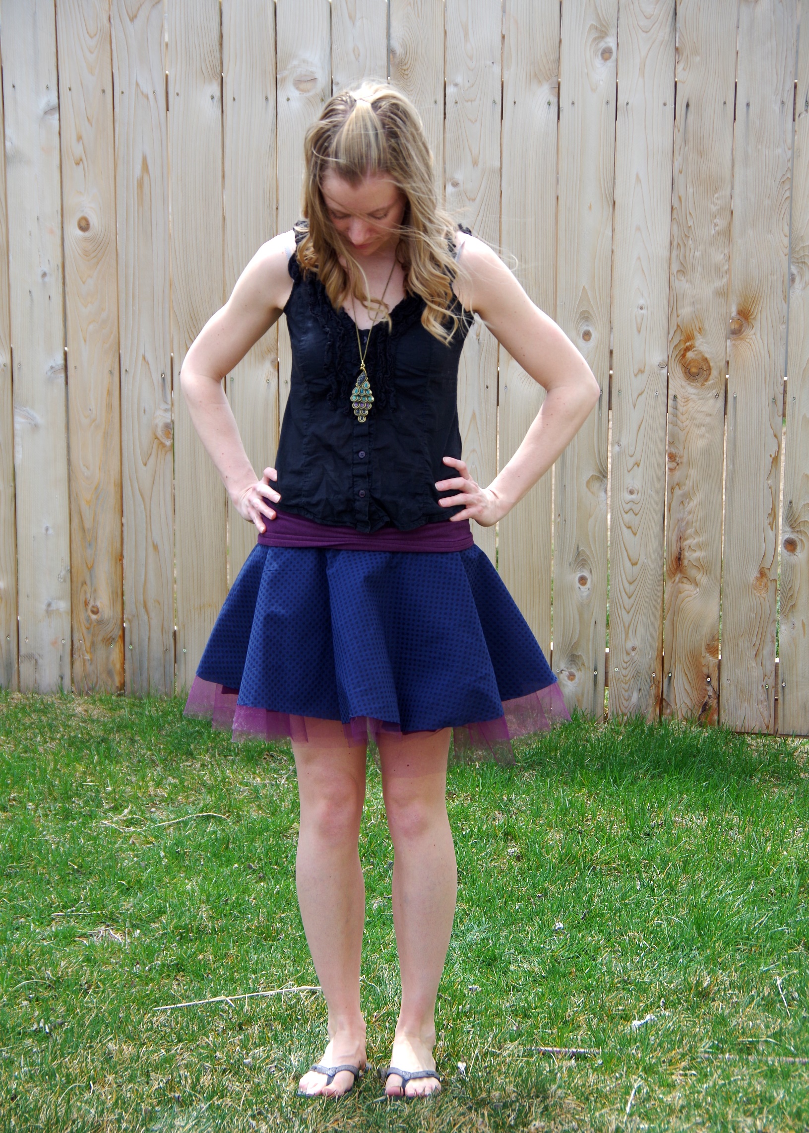 I made this one for the May Sew-along for Pretty Girls Sew. They chose Simplicity 1427 aka the Tulle Skirt. Although I like the idea of a full tulle skirt, I decided to alter that idea a little to make something I might actually wear. First I saw this pin and thought it would be perfect! I thought maybe I could do a layer of knit underneath and a few layers of tulle on top. So I found a purple jersey knit and tulle at Jo-Ann’s the other day. That same day, though, I found a cute blue polka-dot chiffon and decided to see what I could combine. I somewhat used this tutorial. For the first round, I just used the polka dot chiffon with three layers of tulle underneath. Then seeing how scratchy it was going to be, I decided to add another inner layer of purple knit. I added the wide yoga-style waistband and voilà – unintentionally made it reversible! Danny likes the purple side better. I can’t decide. It’s super comfy both directions, though! And fun to twirl in (not that I need to in this Wyoming wind… gotta be careful… it flies up on its own!).