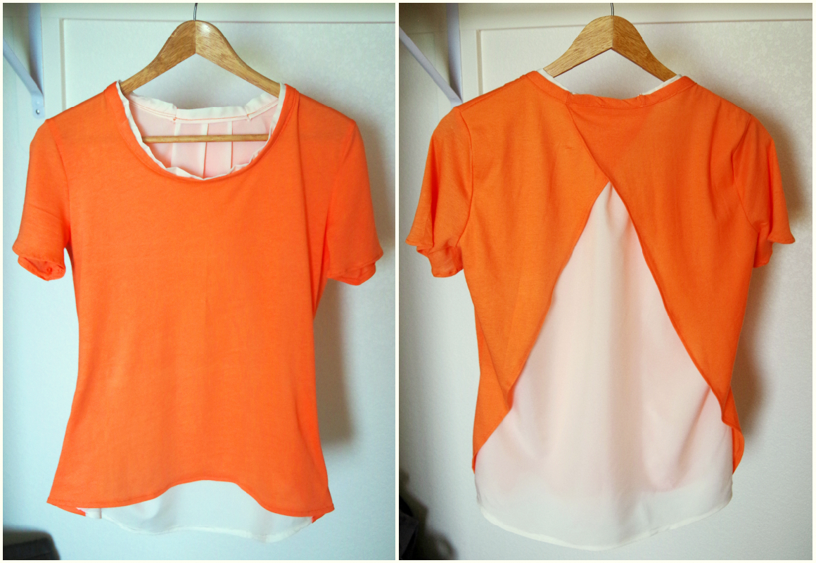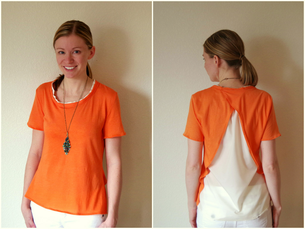 I cut the front panel and the sleeves (view C, size small) straight from the pattern from a “papyrus velour” lightweight orange knit that I got from the remnants stash at JoAnn’s. I eyeballed the back, cutting the two diagonal panels. Then used a semi-sheer cream colored fabric from my grandma stash for the rest of the back – I used the pattern, but left an extra couple of inches in the center so I could add a few pleats at the top and rounded the bottom hemline. The neckline didn’t turn out as great as I was hoping. I made it too thick for the rest of the shirt. I also need to learn how to hem thin knits (so my sleeves don’t get all stretched out and wavy)… but overall I like how it turned out. I’ll definitely be willing to wear it in public :)