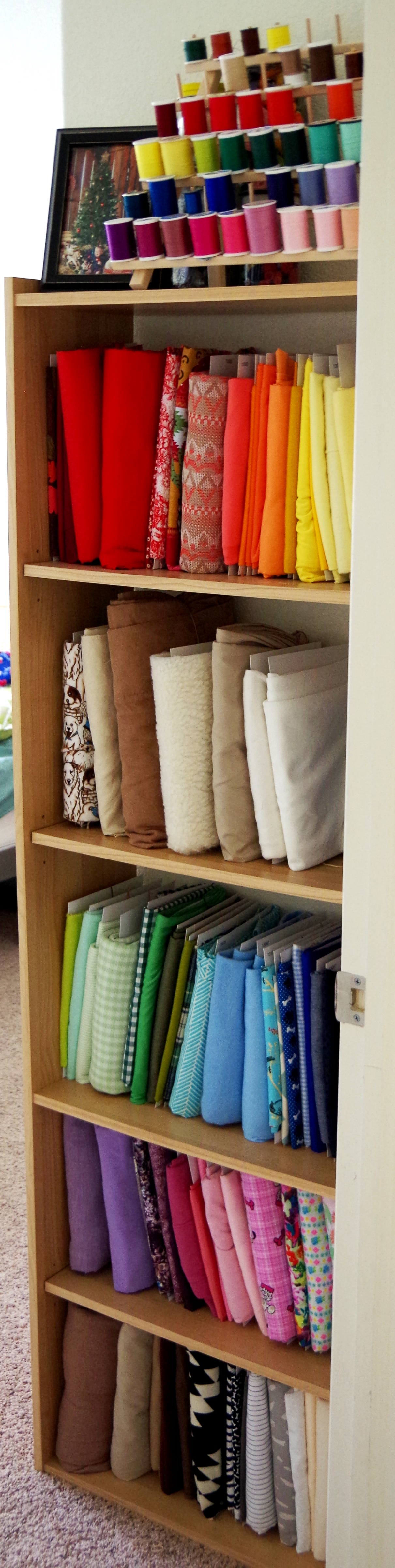It’s nearly impossible to get a good photo of my fabric… it fits perfectly in the little space by the guest/sewing room door… but it’s at a terrible angle to get a photo… this doesn’t include all the new stuff, and all of my bulky fabrics are currently stored in the top of the guest/sewing room closet (not very neatly, might I add… gotta work on that…). I just ordered more comic book backing boards because I already ran out of the first pack. Gotta get to making…