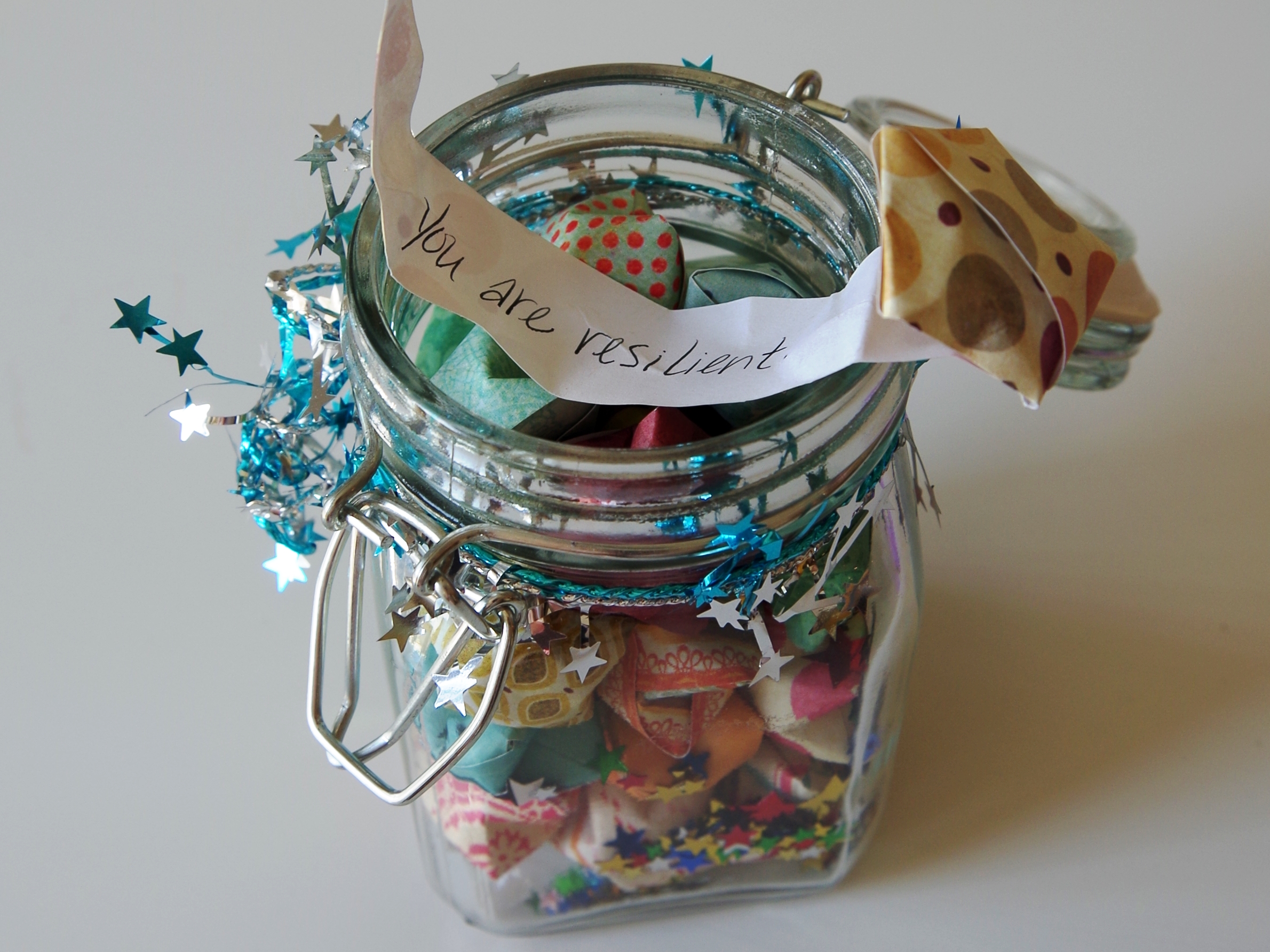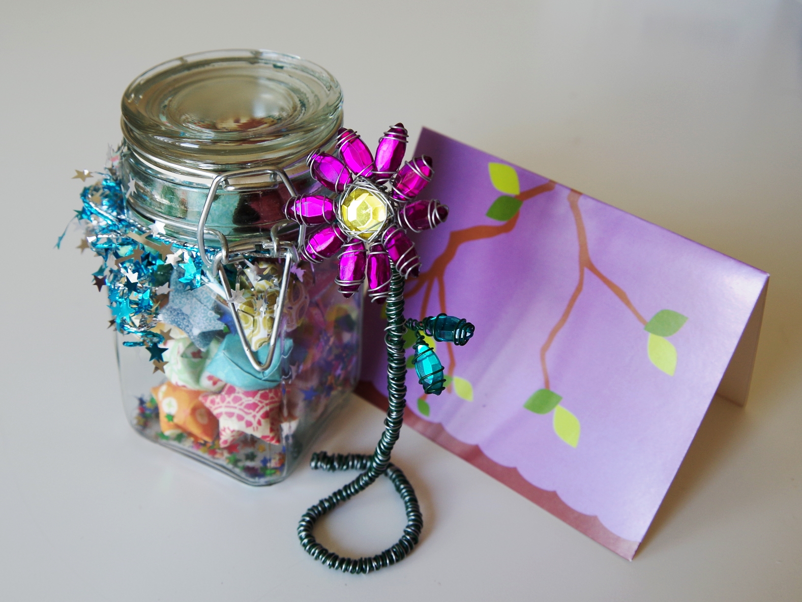 “Enclosed are a flower that will never die and a jar of stars. When you need a pick-me-up, shake the jar and pick a star. Pinch it flat and find the arrow. Pull out the flap and unravel the star for a special message. Enjoy!”