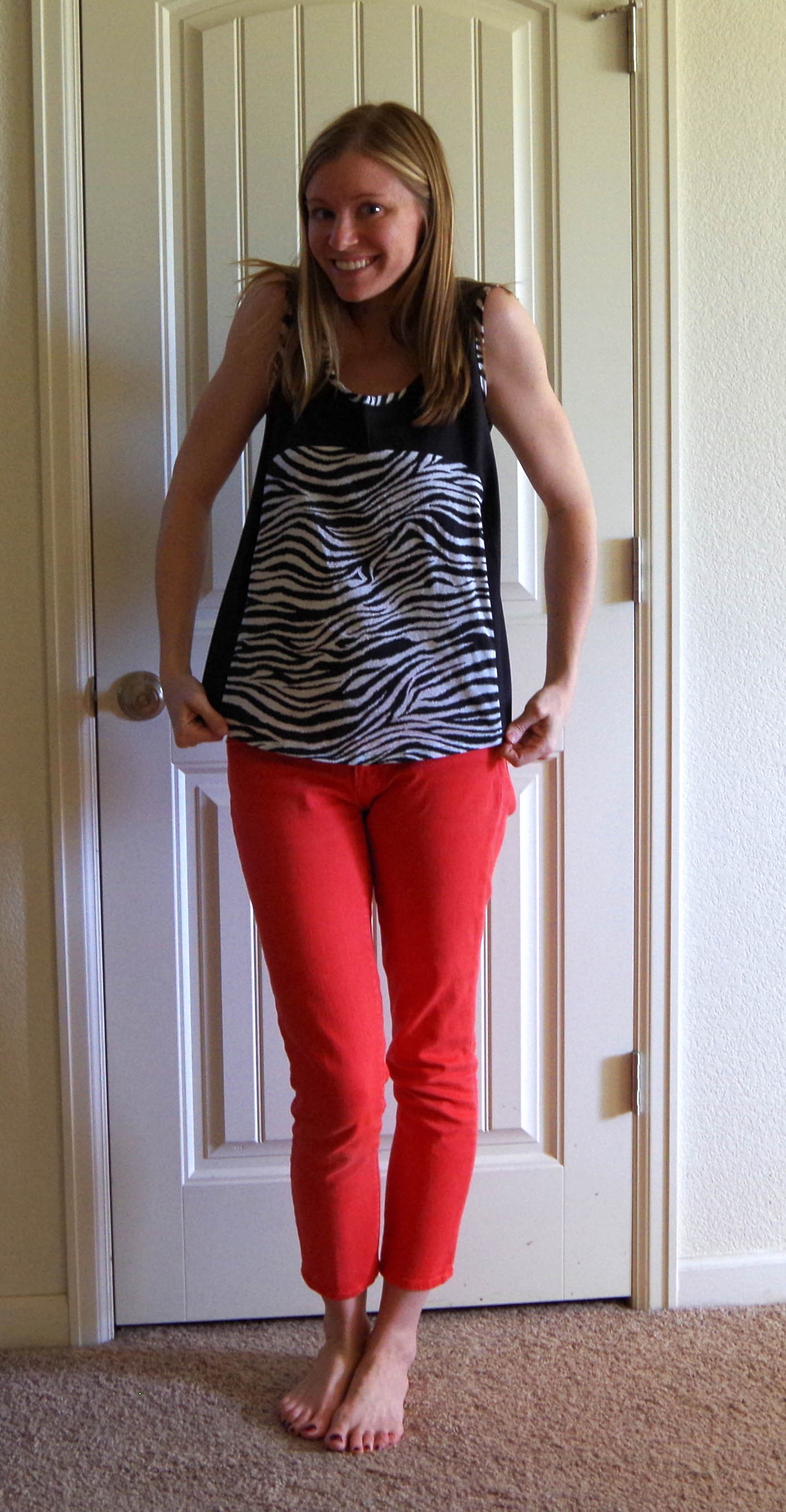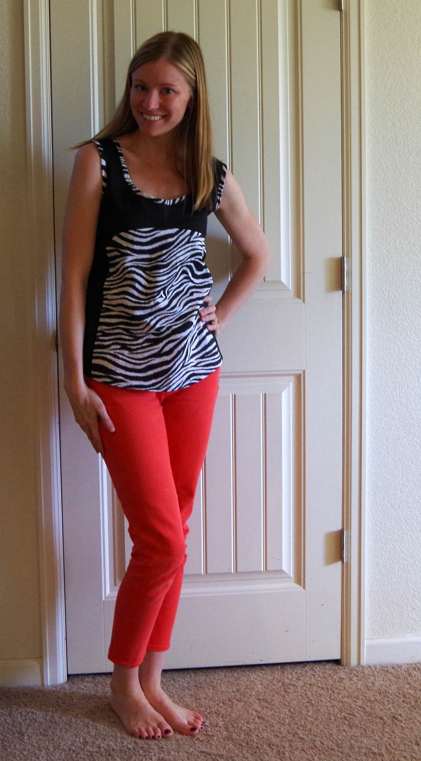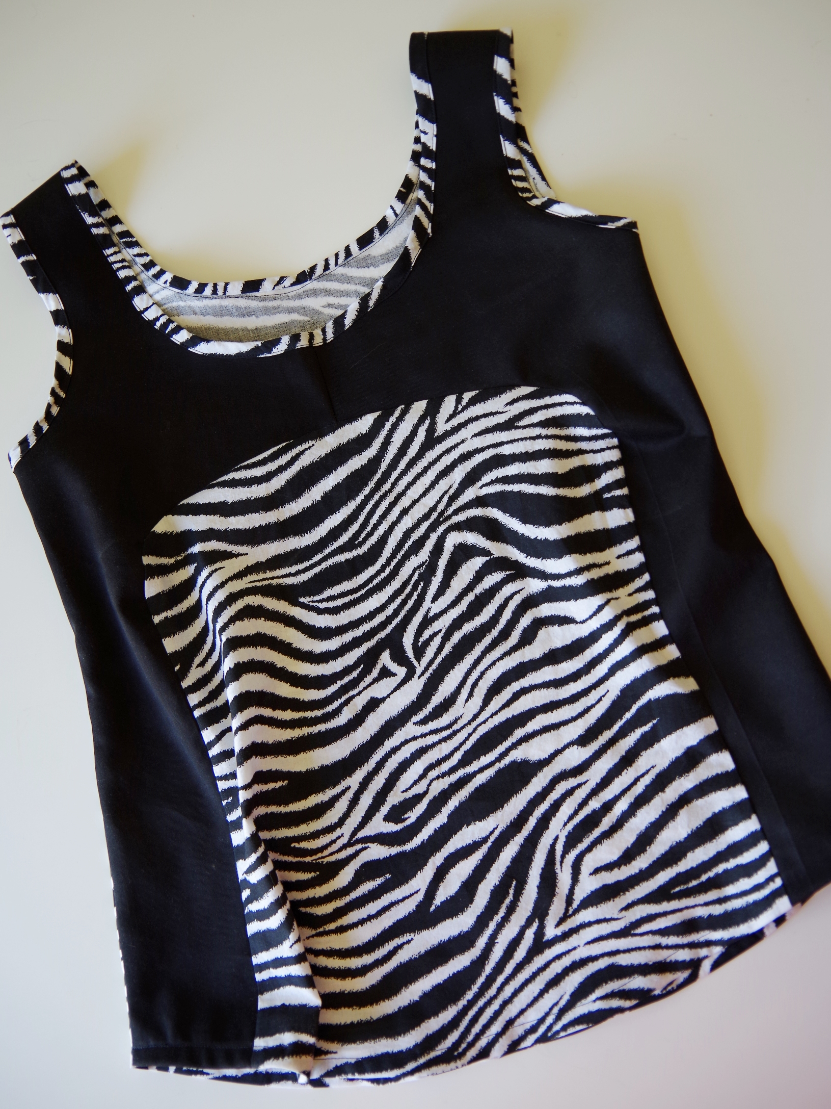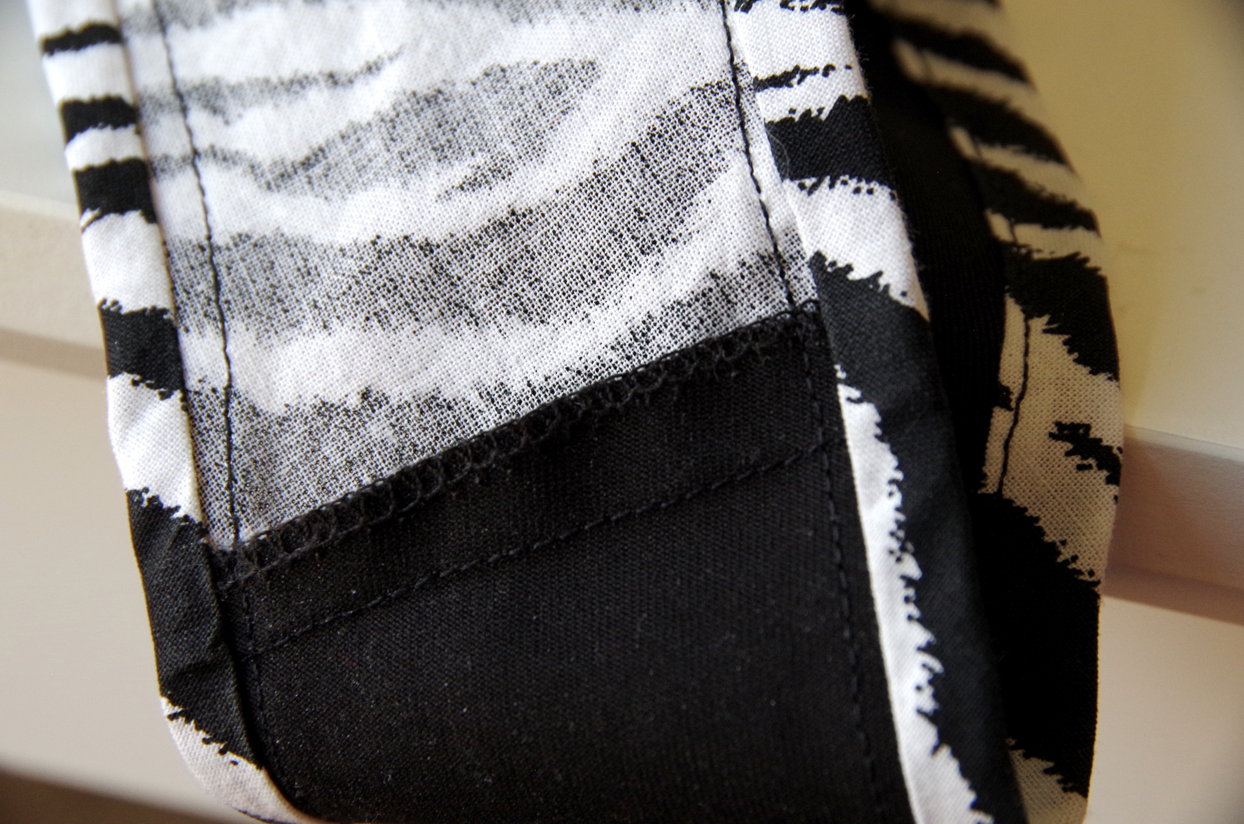 When I was younger, my favorite bathing suit was zebra print and hot pink; along with that, I still have a furry zebra print blanket in my living room. I guess I have a soft spot for the pattern. :) At this point in my life, I wouldn’t normally look for something zebra print to actually wear, but as soon as I read the theme of the Monthly Stitch July challenge… I knew I’d found a use for the zebra print fabric I’ve had lying around since Christmas.