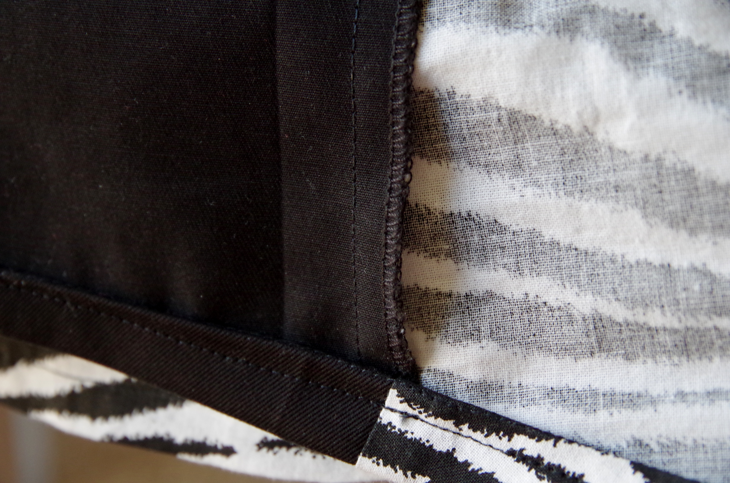 In an effort to stick with my Summer Stashbust plan and not buy any new fabric until September… the black fabric came from another one of Danny’s ripped pairs of work pants. :) Because I had to cut it from two pieces, I just pieced them together in the middle. The grain is off… but it’s black… it goes together well enough…right!? :)