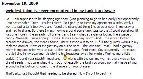 Meet Mr. Grundy Mouse. Don’t let him fool you though – the only place those poison pellets went were to various other locations throughout my apartment. Here’s an excerpt from my old Xanga blog from that first mouse experience: