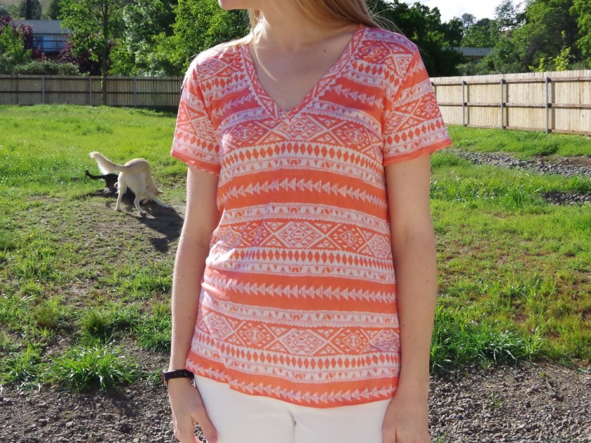 Pattern: Hey June Union St. Tee. I’m pretty sure the sentiment about this pattern is consistent across the blogsphere – it’s a wonderful pattern! It’s a simple top, but the directions are great. It was my first time with a v-neck, and it turned out a lot easier than I was imagining. The fabric didn’t have a lot of stretch, so I sized up to the medium and I think it worked out perfect for this one. If I had a stretchier material, I may have gone down to the small – which I think I’ll try next time. I got this pattern at the same time as the Sloan Leggings pattern I used for my puppy leggings and I have to say I’m very impressed with her patterns :) Lots of size, printing, and customization options! On that note, I already have fabric picked out for a Union St. Tee Dress :)