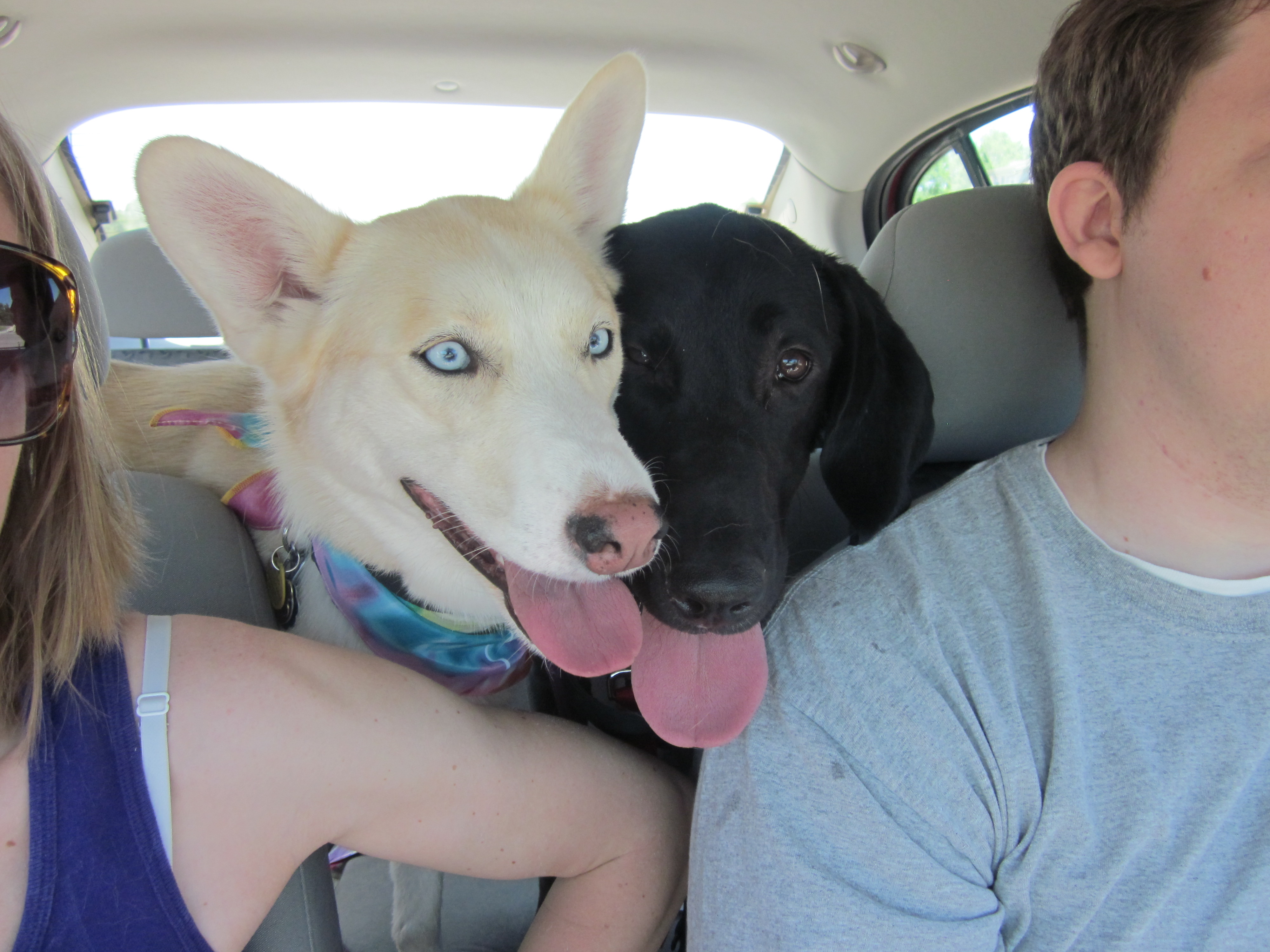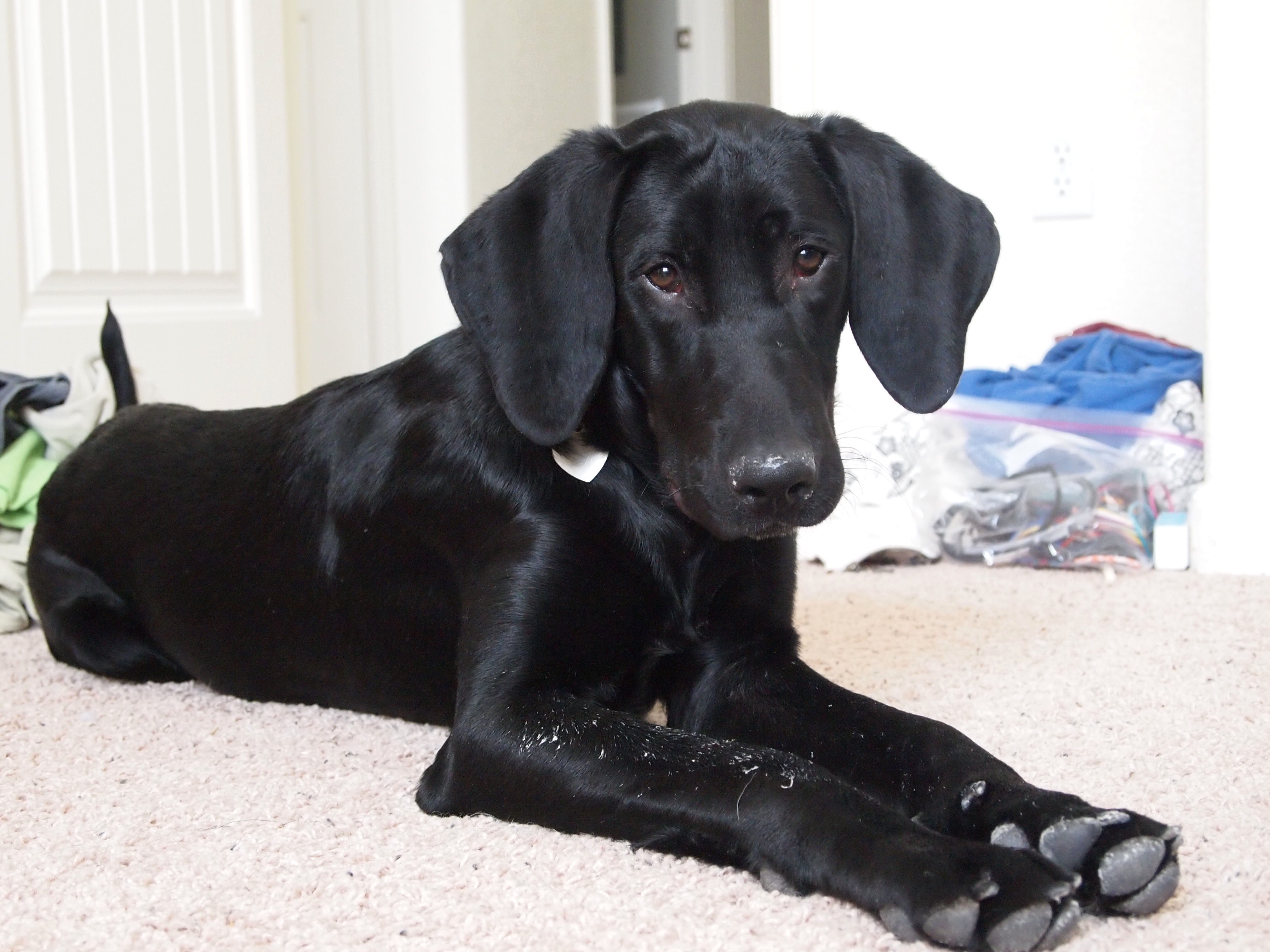 Fast forward to July 2012. Danny was now in Cheyenne and I had convinced him we should start fostering. I’d started volunteering with Black Dog Animal Rescue a few months earlier, and wanted to take my volunteering to the next level (a.k.a. play with more pups). :) So we did. And it was amazing. Six foster pups later, fast forward to January 2013, we had moved to a nicer place and I was slated to deploy soon… sooo once our current foster at the time got adopted we decided to hold off on fostering. In February, I found out they were indefinitely postponing my deployment because of budgetary issues (it was going to be amazing by the way… it was supposed to be on the USNS Comfort for a humanitarian mission to Central America). But anyway, once I found out it was postponed, just about the first thing I did was start scanning the list of available pups to foster. There were two adorable young black lab/hound mixes on the list… one girl and one boy. I couldn’t resist the ears on the little boy, so I suggested him to Danny. He said no… that he looked too big in the picture (we’d found that Zoe did better with the smaller fosters). So I sent an email off and asked if we could foster the girl, only to find out she had just been adopted (yay for her!). The foster coordinator at the time asked if we would be interested in another one on the urgent list that looked very similar… a boy. So we said sure. I figured he was the same one, but we weren’t positive by the way she had described him. Sure enough it was him. I went to pick him up from the center on a weekend when Bethany was visiting. I instantly wasn’t sure what I was getting myself into. He was a big, strong, skinny lug who started barking viciously at another dog that was there and almost pulled me to the ground multiple times on the way to the car. Because of his reaction to the other dog at the center, I was very nervous about the impending meet and greet with Zoe. It’s always tough the first time they meet… you never quite know what’s going to happen. But all of our meet and greets had been successful so far with other dogs, so I hoped for the best. I decided to keep Zoe in her outdoor kennel while I let Finn roam around the house and the yard, getting all of his sniffing taken care of. As soon as he ran out to the kennel to sniff Zoe, I got nervous, but I watched and waited. No growling, no hair standing on end, no barking… just sniffing and excitement like they wanted to play. After a little more time, I decided to go for it and let her out. They started playing right away. It was an oddball match made in heaven. Danny quickly fell in love with this dog who he never expected he would even like (to be fair, he was a cat person when he moved to Wyoming) ;) and after scheduling him for his first adoption drive, we had a long talk and decided we couldn’t bear to see him go yet and put him on hold (BDAR lets potential adopters put a dog on hold for up to 7 days to give them time to make a decision). It really wasn’t a decision; I’m pretty sure we both knew Finn had already inserted himself into the family… it just took us a few days to realize that we were officially foster failures (a.k.a. when you fail as a foster parent and adopt your foster). It’s the only time in my life I’ve been so excited to be a failure. Finn has since almost doubled in weight, he has destroyed more shoes than I can count on my fingers and toes, and he has attempted to eat us out of house and home… and I absolutely could not be happier that he is now a part of our lives.
